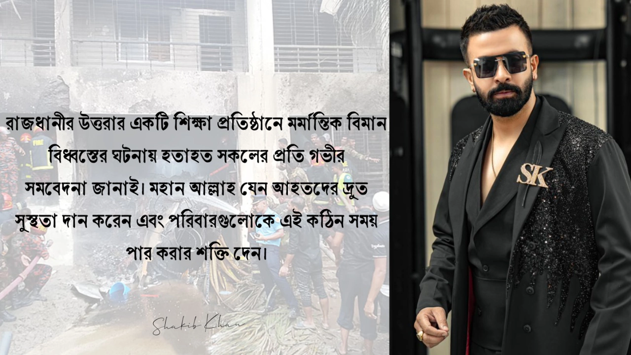 উদ্ধার অভিযান এখনো চলমান রয়েছে। দুর্ঘটনার পর সোশ্যাল মিডিয়ায় ছড়িয়ে পড়েছে ঘটনাস্থলের ভিডিও ও ছবি। হৃদয়বিদারক এই দৃশ্য নাড়া দিয়েছে শোবিজ অঙ্গনকেও। ঘটনাটি নিয়ে দেশের জনপ্রিয় নায়ক শাকিব খান নিজের ফেসবুক পেজে লিখেছেন, ‘রাজধানীর উত্তরার একটি শিক্ষাপ্রতিষ্ঠানে মর্মান্তিক বিমান বিধ্বস্তের ঘটনায় হতাহত সবার প্রতি গভীর সমবেদনা জানাই। মহান আল্লাহ যেন আহতদের দ্রুত সুস্থতা দান করেন এবং পরিবারগুলোকে এই কঠিন সময় পার করার শক্তি দেন।’ শাকিবের এই পোস্টে হাজারো অনুরাগী শোক প্রকাশ করেছেন। দুর্ঘটনায় নিহত ও আহতদের প্রতি শোক ও সমবেদনা জানাচ্ছেন সর্বস্তরের মানুষ।