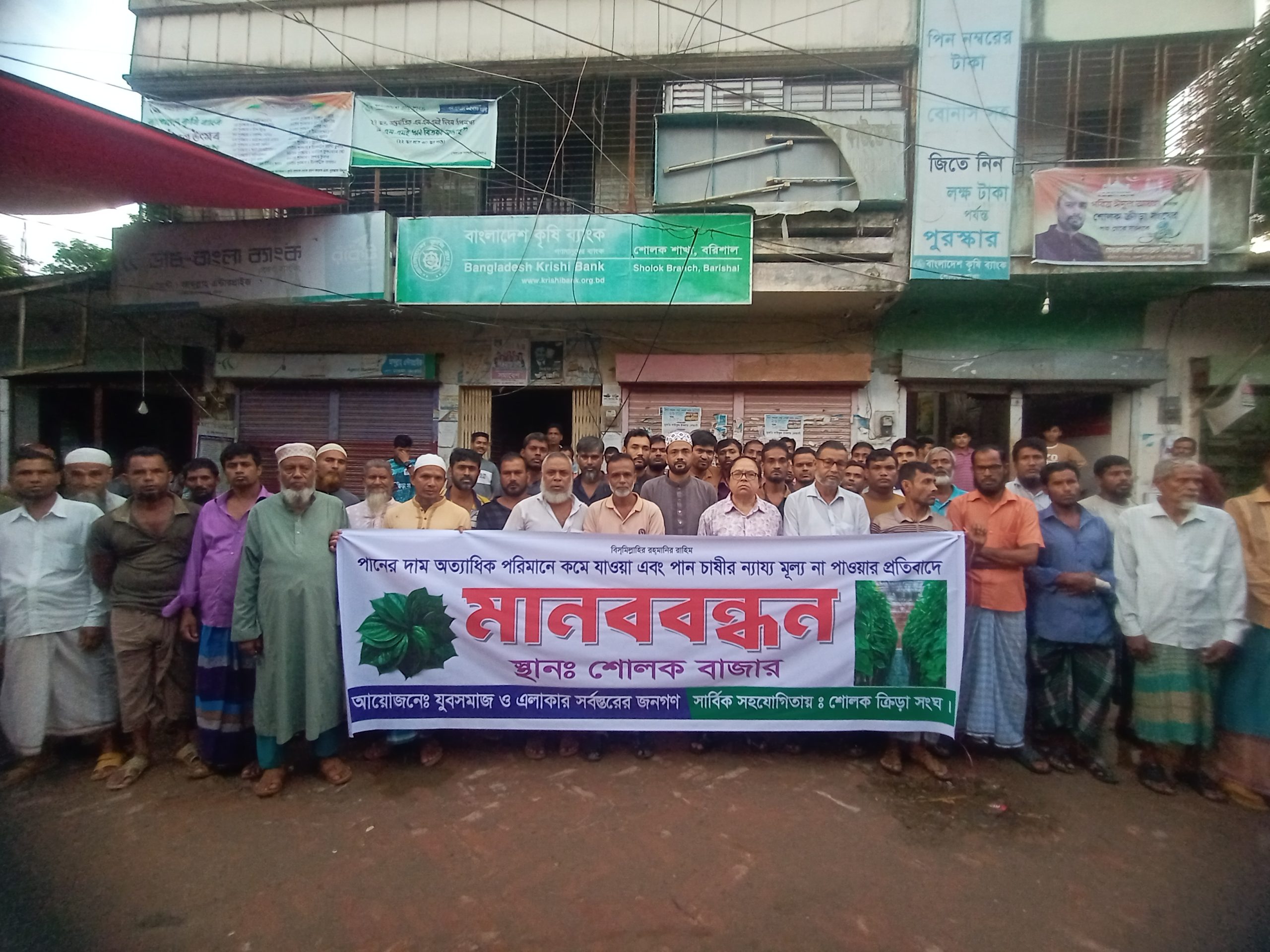 (সিনিয়র রিপোর্টার, সোয়েব সিকদার) -বরিশালের উজিরপুরের ঐতিহ্যবাহী শোলক গ্রামে আজ বিকেলে স্থানীয় যুব সমাজ ও এলাকাবাসী পানের দাম কমে যাওয়ায় এবং পানের ন্যায্য মূল্য না পাওয়ার প্রতিবাদে এক মানববন্ধন কর্মসূচি আয়োজন করেন। আয়োজনের সার্বিক সহযোগিতায় ছিলেন শোলক ক্রীড়া সংঘ।