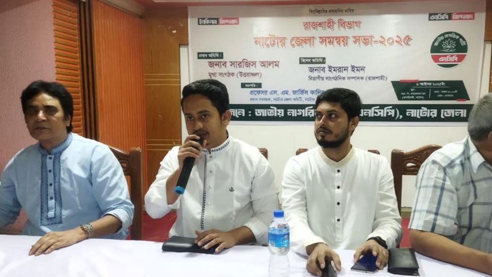 এনসিপির জেলা কমিটির প্রধান সমন্বয়ক প্রফেসর এস এম জার্জিস কাদির বাবুর সভাপতিত্বে অনুষ্ঠানে বিশেষ অতিথি হিসেবে বক্তব্য রাখেন- এনসিপির রাজশাহী বিভাগীয় সাংগঠনিক সম্পাদক ইমরান ইমন, কেন্দ্রীয় সংগঠক ফয়সাল আহমেদ, নাটোর জেলা সিনিয়র সমন্বয়কারী ও নাটোর চেম্বারের সভাপতি আব্দুল মান্নাফ, সমন্বয়ক আব্দুল্লাহ আল নোমান পিয়াস, মো. তৌফিক নেওয়াজ, মাহফুজুল আলম, বৈষম্য বিরোধী ছাত্র আন্দোলন নাটোর জেলা সভাপতি শিশির মাহমুদ প্রমুখ।